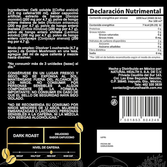Golden Mushroom de Natural Health | Café Soluble con Adaptógenos y Hongos Funcionales | Polvos 300 gr