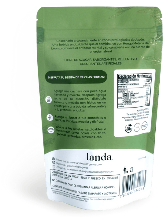 Té Matcha Orgánico Premium + Hongo Melena de León 5g de Landa Adaptógenos | Apoyo Cardiovascular - Antioxidante | 100g - 20 porciones