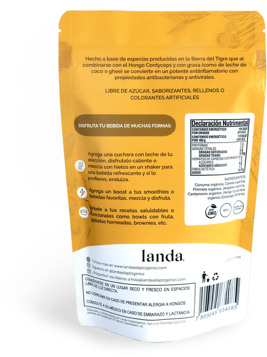 Cúrcuma, Canela, Pimienta, Cordyceps 5g Golden Milk de Landa Adaptógenos | Apoya la digestión y metabolismo | Bolsa de 150g - 30 servicios