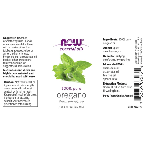 El aceite esencial de orégano de NOW Foods es una esencia 100% pura obtenida por destilación al vapor de la planta Origanum vulgare. Es ampliamente utilizado en aromaterapia natural por su aroma intenso y especiado, que brinda una sensación de limpieza, calidez y renovación emocional.
