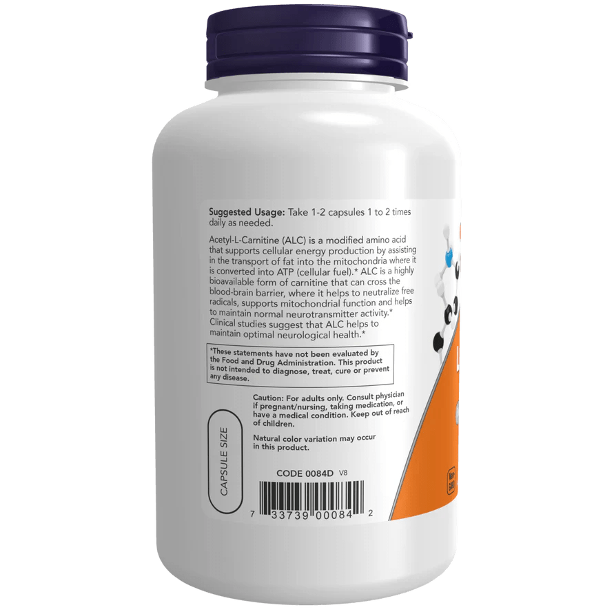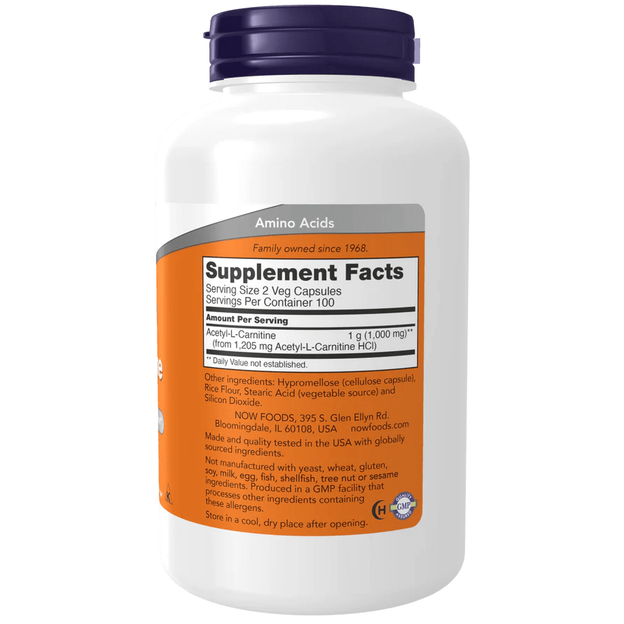 Acetil L-Carnitina 500 mg de Now Foods | Ayuda en la producción de energía celular| 200 Cápsulas Vegetales