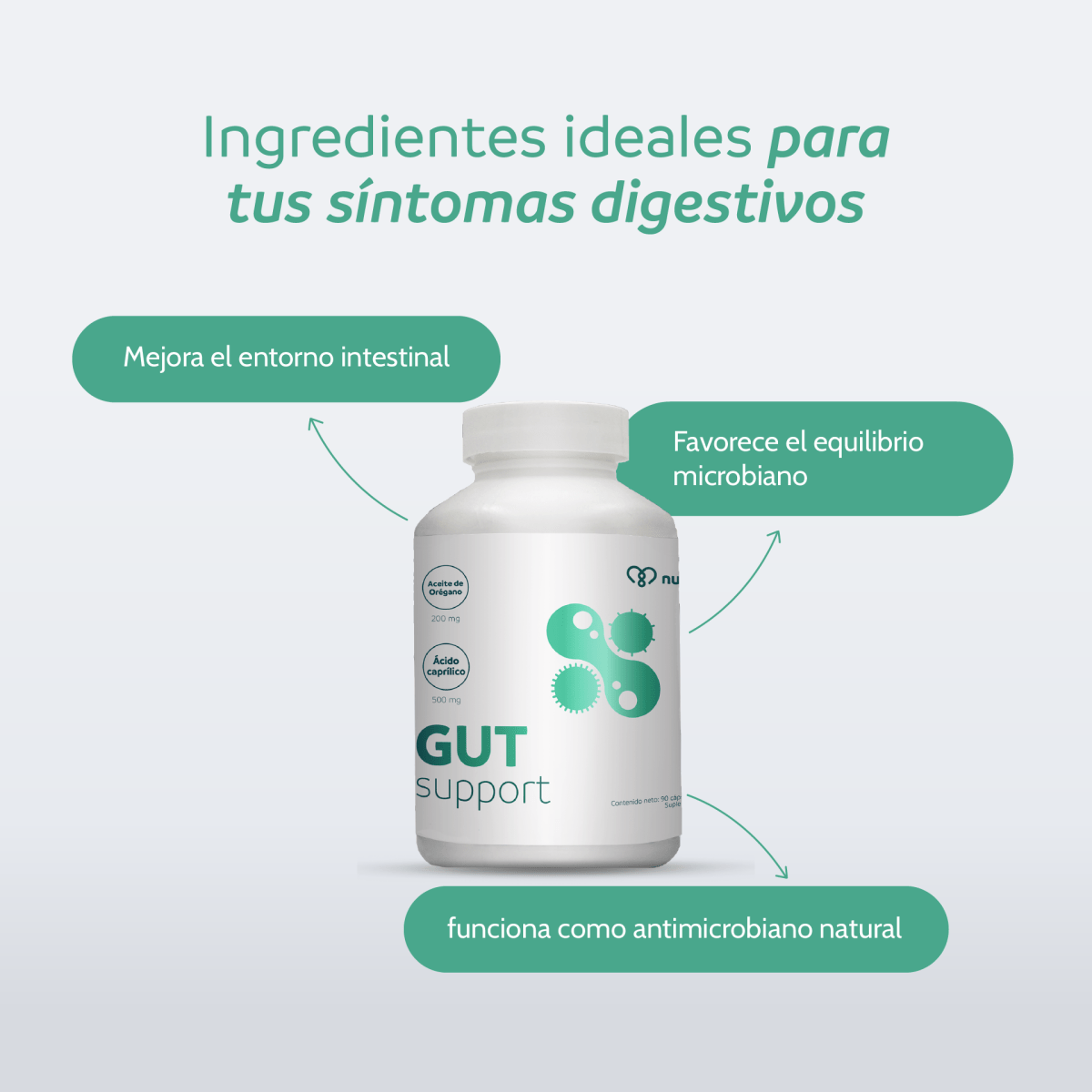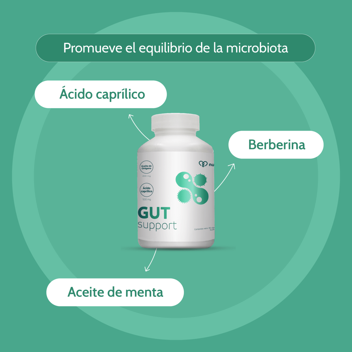 Gut Support de NutriAD es un suplemento diseñado para mantener la salud intestinal mediante una combinación de ingredientes funcionales como ácido caprílico, aceite de menta, berberina, extracto de hoja de olivo y aceite de orégano. Su acción combinada apoya la flora intestinal y combate microorganismos no deseados.
