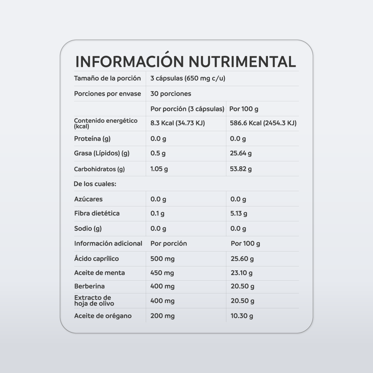 No usar en embarazo, lactancia ni en menores. Consulte a su médico antes de iniciar cualquier suplemento si tiene problemas digestivos o está bajo tratamiento.