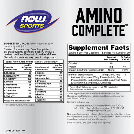 El suplemento Amino Complete de NOW Sports combina 20 aminoácidos esenciales y no esenciales con vitamina B6, ayudando a la síntesis proteica, recuperación muscular y metabolismo energético.