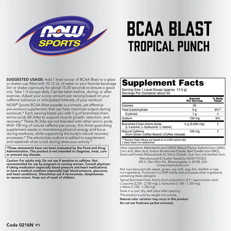 BCAA Blast Tropical Punch de NOW Sports combina aminoácidos de cadena ramificada con cafeína natural para mejorar la energía, resistencia y recuperación muscular en entrenamientos intensos.