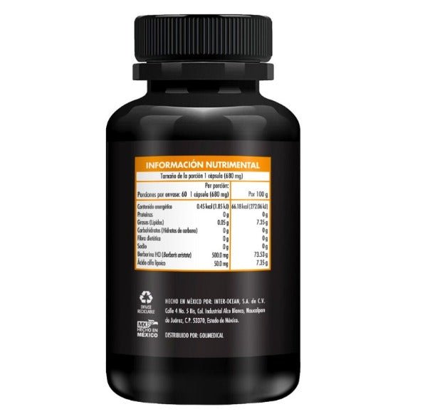 Berberina: Sinergia de glucosa 580mg de Gou Medical | Ofrece apoyo metabólico para una mejor absorción de la glucosa y los lípidos | 60 cápsulas vegetales