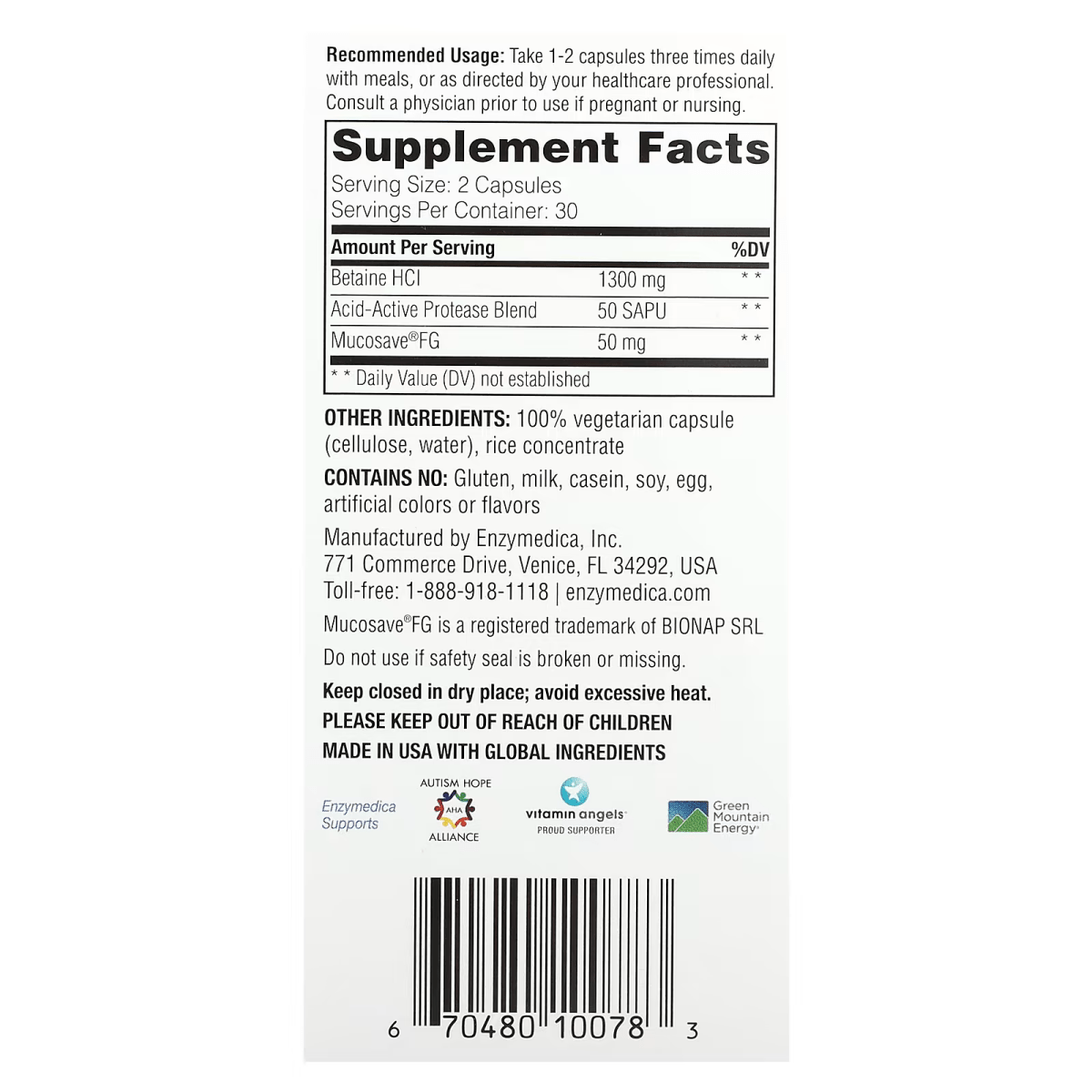 Betaína HCl Enzymedica con enzimas digestivas | Bienestar digestivo | 60 cápsulas