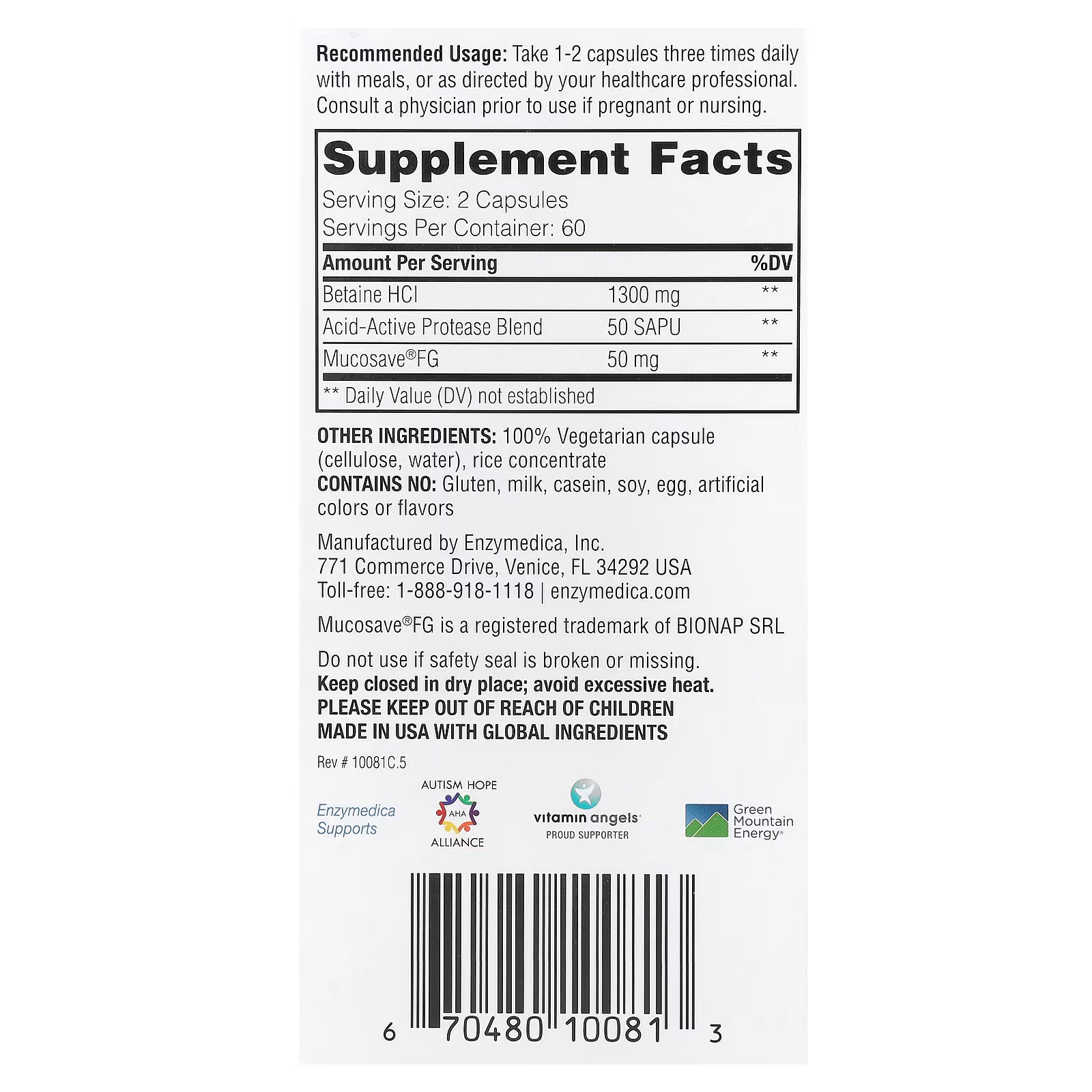 Betaína HCl Enzymedica con enzimas digestivas | Bienestar digestivo | 120 cápsulas