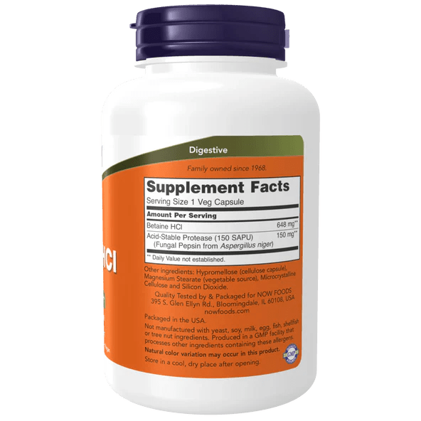 Betaína HCl de NOW es un suplemento digestivo formulado con 648 mg de betaína hidrocloruro y 150 mg de proteasa ácida por cápsula. Contribuye a mejorar la digestión de proteínas y promover un ambiente estomacal saludable, sobre todo en personas con baja producción de ácido gástrico.