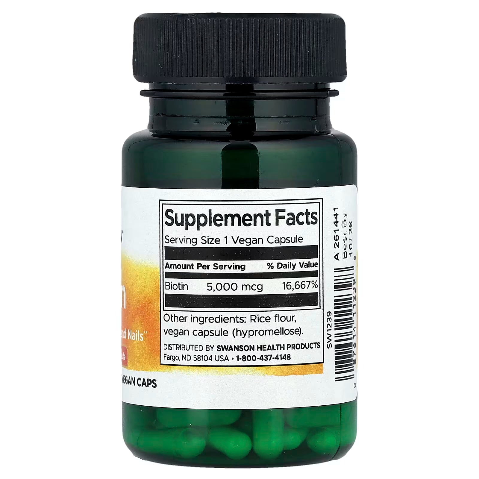 Biotina 5000 mcg de Swanson | Promueve el cuidado del cabello, piel y uñas | 30 cápsulas vegetales