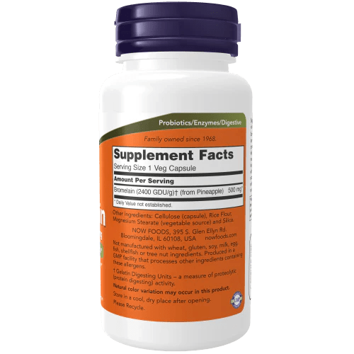 Bromelina 2400 GDU/g – 500 mg de NOW Foods | Enzima Proteolítica Natural, Apoya Digestión Saludable y Confort Articular | 60 y 120 Cápsulas Vegetales