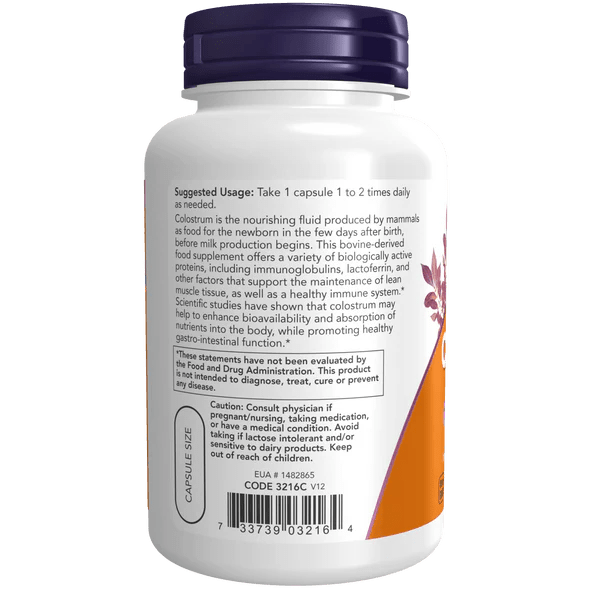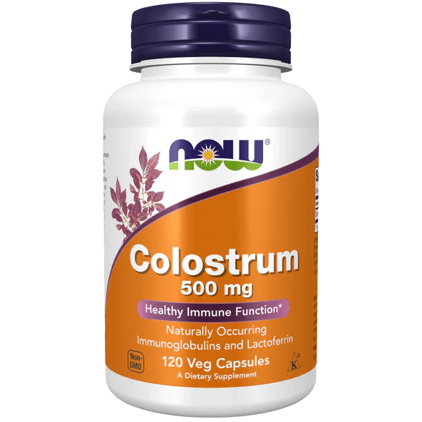 NOW Colostrum es un suplemento alimenticio en cápsulas vegetales que contiene colostro bovino deshidratado, fuente natural de inmunoglobulinas y lactoferrina. Su fórmula de 500 mg por cápsula ayuda a respaldar el sistema inmunológico y el bienestar general.