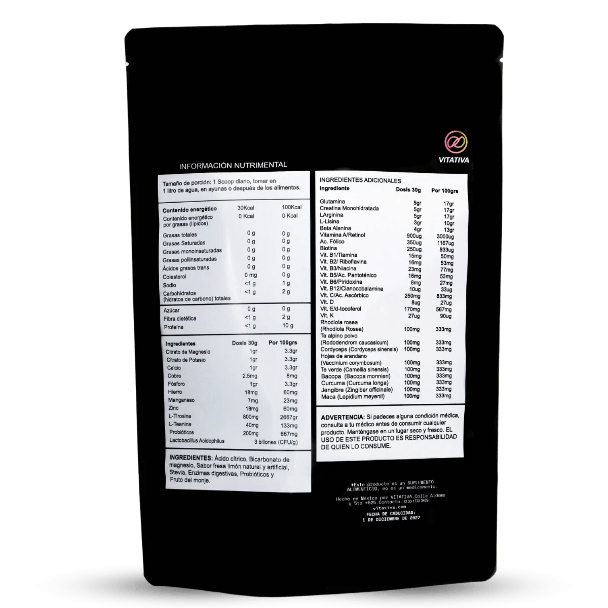 Kraken Metabolic de Vitativa es un suplemento en polvo que combina creatina, aminoácidos, vitaminas del complejo B, adaptógenos y probióticos para apoyar el rendimiento físico y el bienestar integral. Ideal para quienes buscan aumentar su fuerza, energía y recuperación diaria.