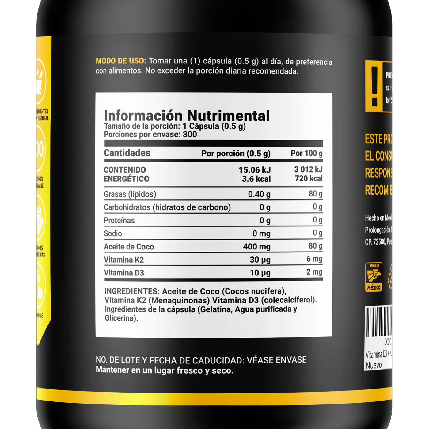 Aceite de Coco + Vitaminas D3 y K2 B Life® 300 cápsulas combina 400 mg de Aceite de Coco con las poderosas Vitaminas D3 y K2, ingredientes clave para promover la absorción óptima de calcio, contribuyendo al bienestar general. Esta fórmula única y concentrada ofrece una manera eficiente de incorporar estos nutrientes esenciales en tu rutina diaria. Contiene 300 cápsulas.