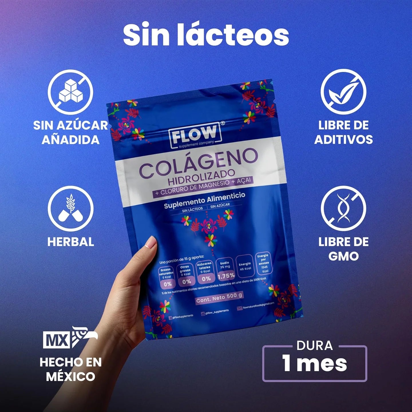 Colágeno Hidrolizado + Cloruro de Magnesio + Acaí 15g de Flow Supplements | Fortalece huesos y articulaciones, apoyando la función muscular | Polvo de 500g