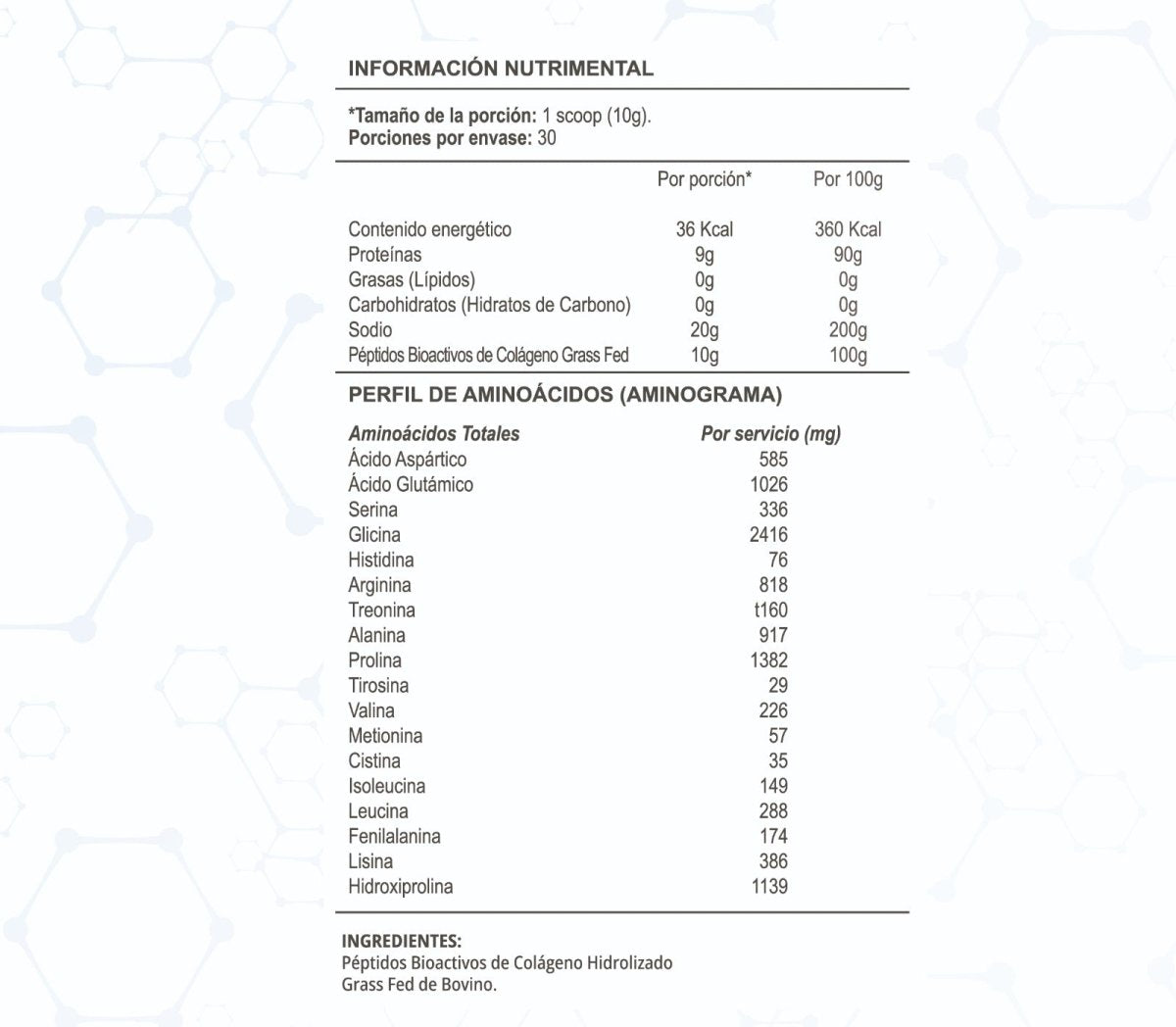 Otros ingredientes: No declara aditivos; únicamente péptidos bioactivos de colágeno hidrolizado de origen bovino Grass-Fed.