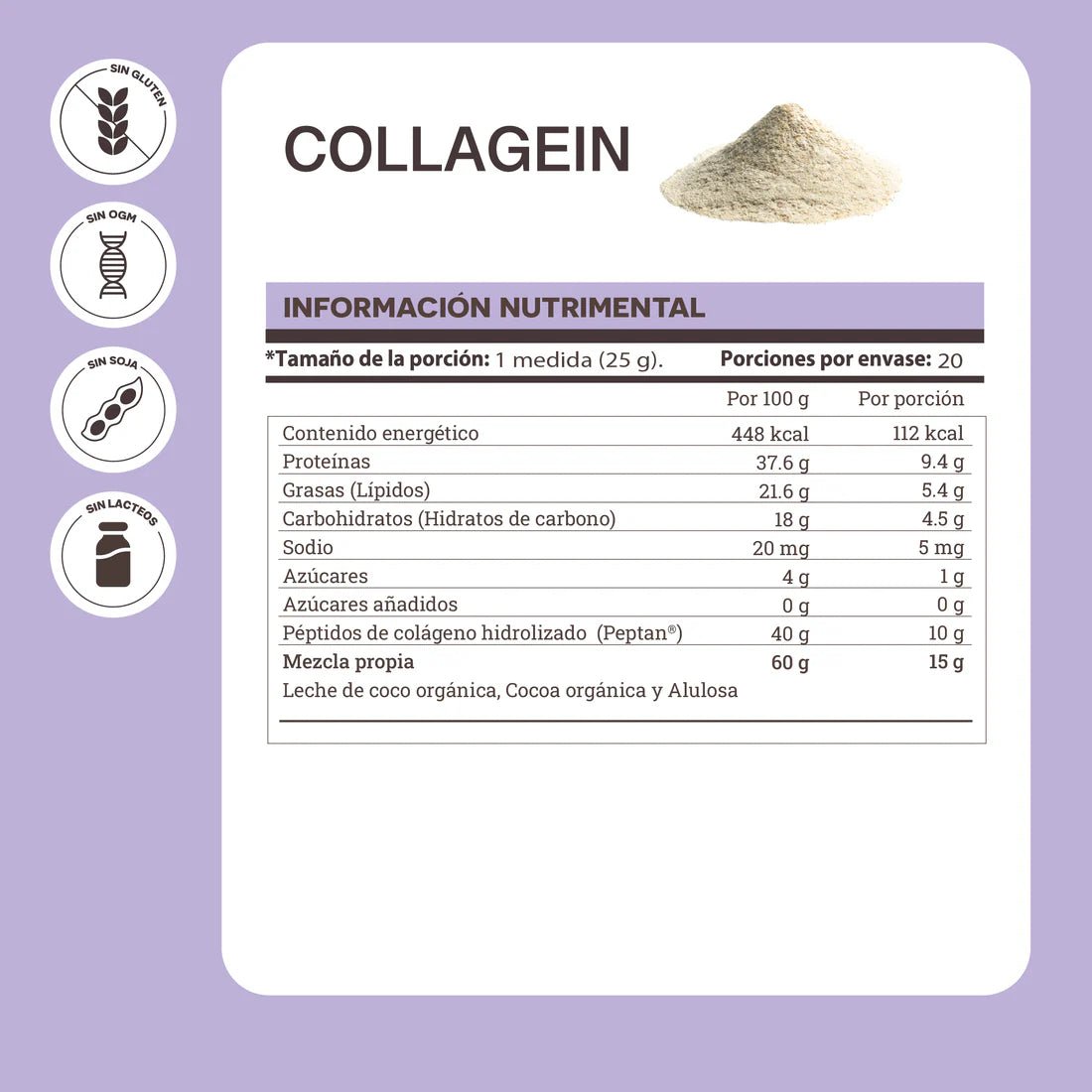 Collagein es un suplemento en polvo con colágeno hidrolizado Peptan®, leche de coco orgánica y cocoa belga, ideal para cuidar piel, cabello y articulaciones.
