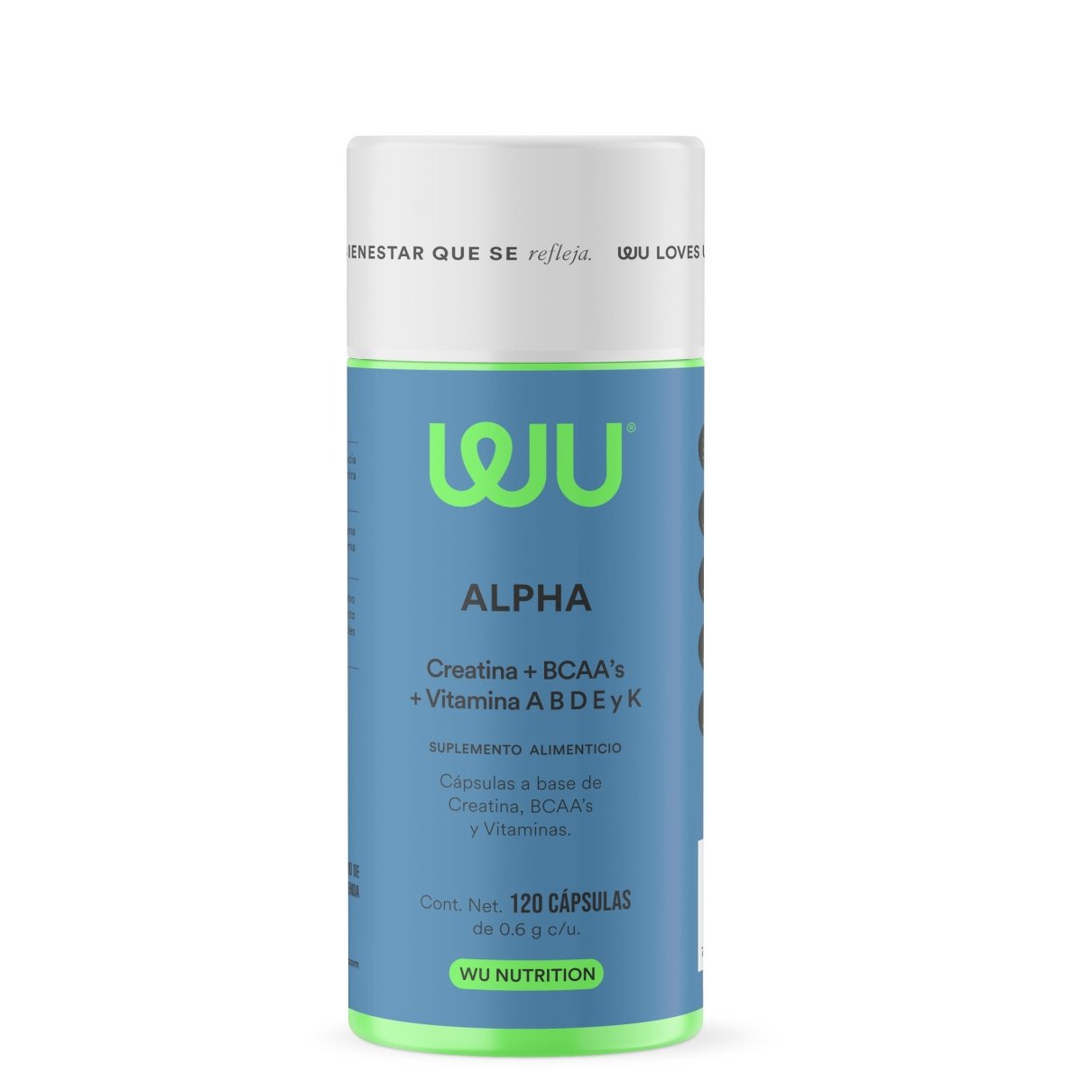 Alpha de WU Nutrition es un suplemento que combina creatina, BCAA’s, inositol, magnesio y un complejo de vitaminas A, B, D, E y K, diseñado para apoyar el metabolismo energético, el rendimiento físico y la recuperación muscular.