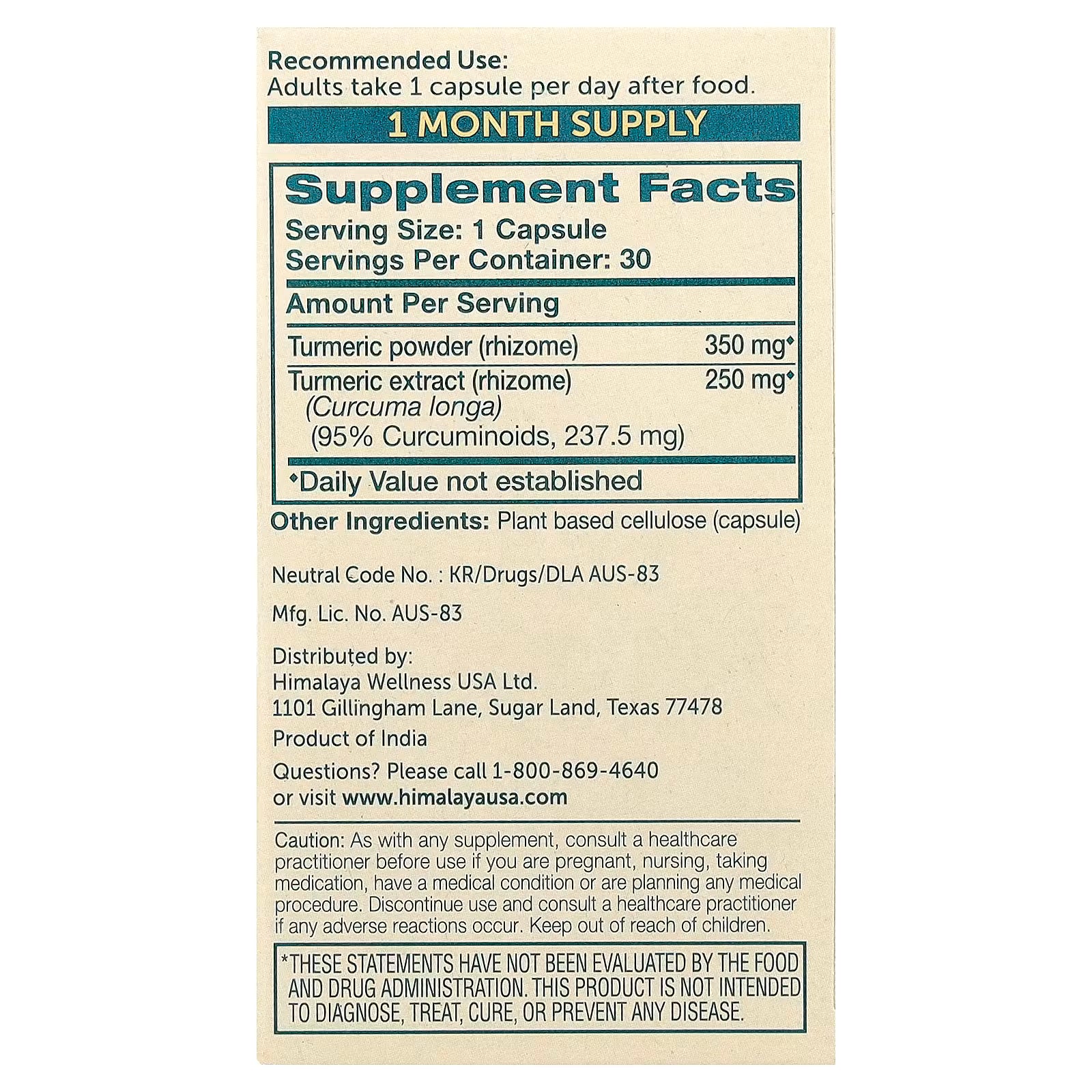 Cúrcuma 95, Turmeric 95 Himalaya | Favorece el bienestar digestivo | 30 Cápsulas