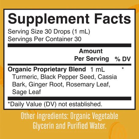 El Organic Turmeric Gold Liquid Drops de MaryRuth’s es un suplemento herbal líquido que combina cúrcuma, pimienta negra, jengibre, romero y salvia, conocidos tradicionalmente por sus propiedades antioxidantes y su apoyo al bienestar general.