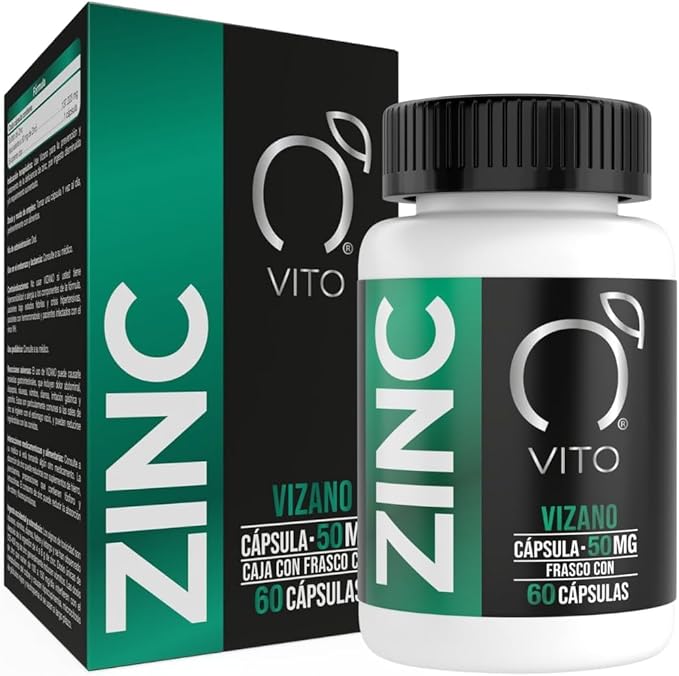 Zinc 50 mg Vizano de VITO es un suplemento formulado para apoyar el funcionamiento del sistema inmunológico y múltiples procesos celulares. Contiene sulfato de zinc equivalente a 50 mg por cápsula, una dosis ideal para complementar las necesidades diarias de este mineral esencial.