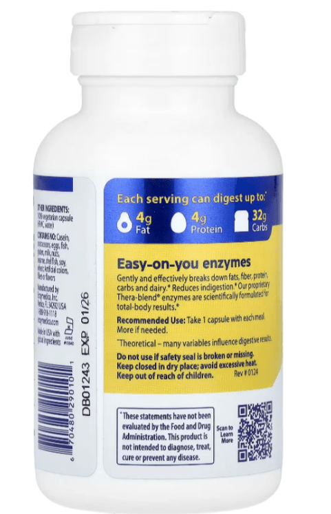 Es un producto vegano, kosher, libre de gluten, soya, lácteos y conservadores. Su mezcla incluye enzimas específicas para digerir carbohidratos, proteínas, grasas, fibra y lactosa.
