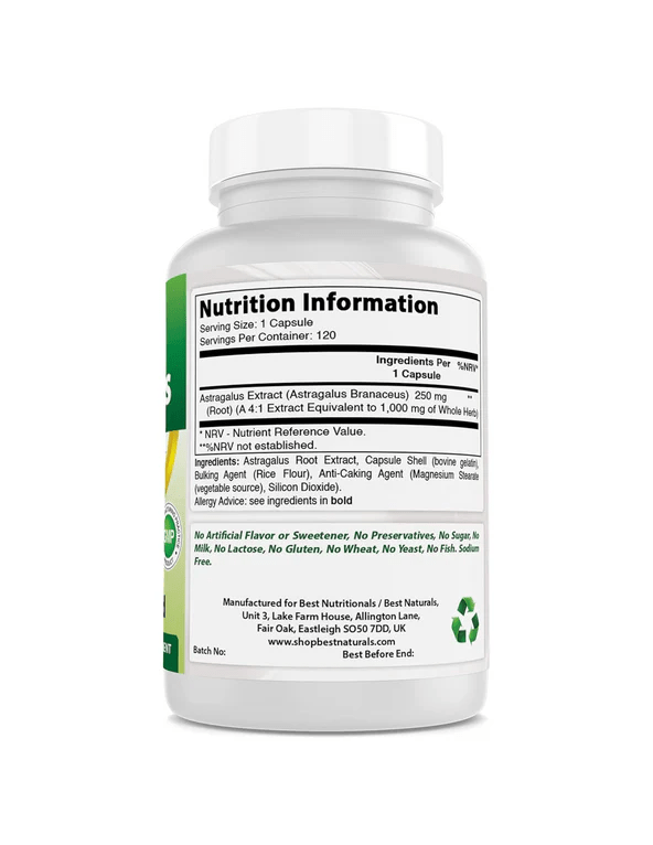 El astrágalo es una raíz adaptógena usada tradicionalmente en la medicina oriental por sus efectos positivos sobre el sistema inmunológico y el equilibrio general del organismo. La fórmula de Best Naturals aporta el equivalente a 1000 mg por dosis diaria, en cápsulas prácticas, sin conservadores, sin gluten ni alérgenos comunes.