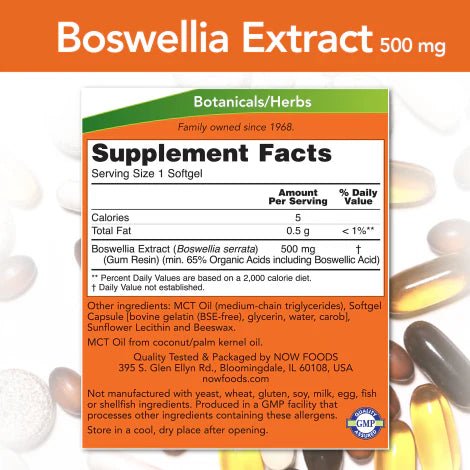 Boswellia Extract 500 mg de NOW es un suplemento natural elaborado a partir de resina de Boswellia serrata, con un alto grado de estandarización (65% de ácidos orgánicos, incluyendo ácido boswélico). Esta fórmula, en cápsulas softgel, está diseñada para apoyar un sistema inmune equilibrado y promover el confort articular.