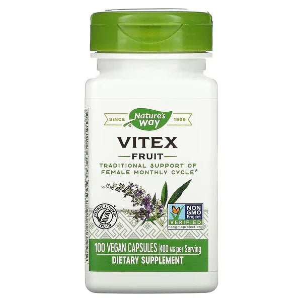 Vitex Fruit es un suplemento natural de Nature's Way que contiene Vitex agnus-castus, una planta tradicionalmente utilizada para brindar apoyo al ciclo menstrual y promover el equilibrio hormonal en mujeres. Su fórmula en cápsulas veganas lo hace ideal para quienes buscan opciones libres de productos animales y sin ingredientes modificados genéticamente.