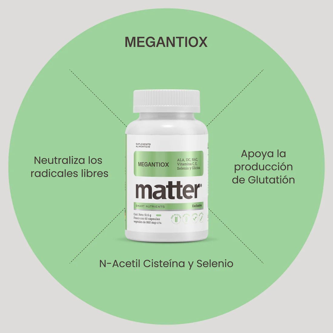 Fórmula Exclusiva con ALA, I3C, NAC, Vitamina C, Vitamina E, Selenio y Glicina 860mg - Antioxidantes Megantiox Matter | Apoya la producción de glutatión y protege al organismo contra el daño oxidativo | 60 Cápsulas Vegetales