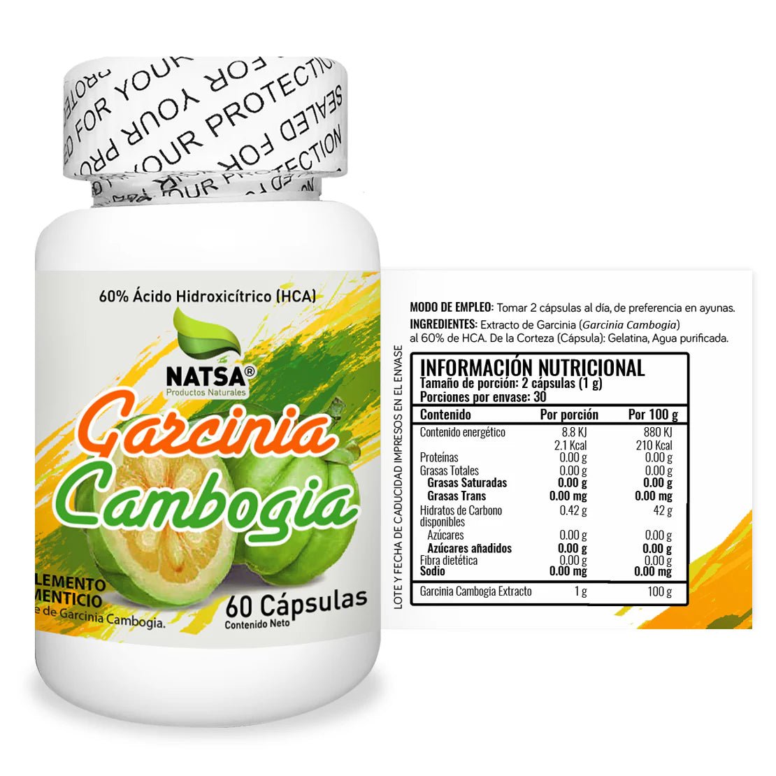 Garcinia Cambogia NATSA es un suplemento en cápsulas formulado con extracto de Garcinia Cambogia estandarizado al 60% de ácido hidroxicítrico (HCA), reconocido por su potencial para apoyar el *control del apetito* y ayudar en procesos de reducción de grasa corporal.