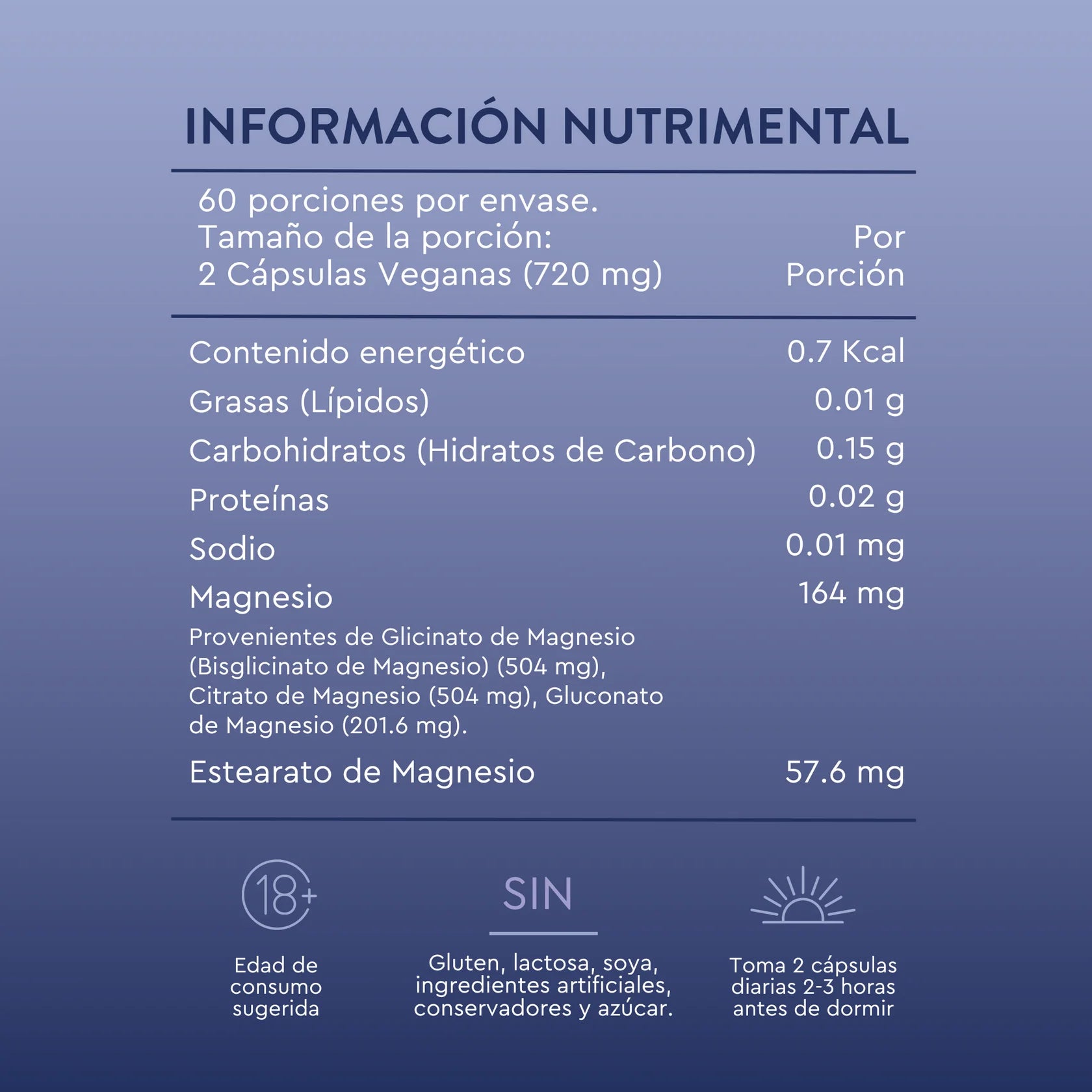 Gracias a su fórmula vegana y libre de gluten, es bien tolerado por personas con sensibilidad alimentaria. Su combinación de sales permite una absorción gradual y constante durante la noche.