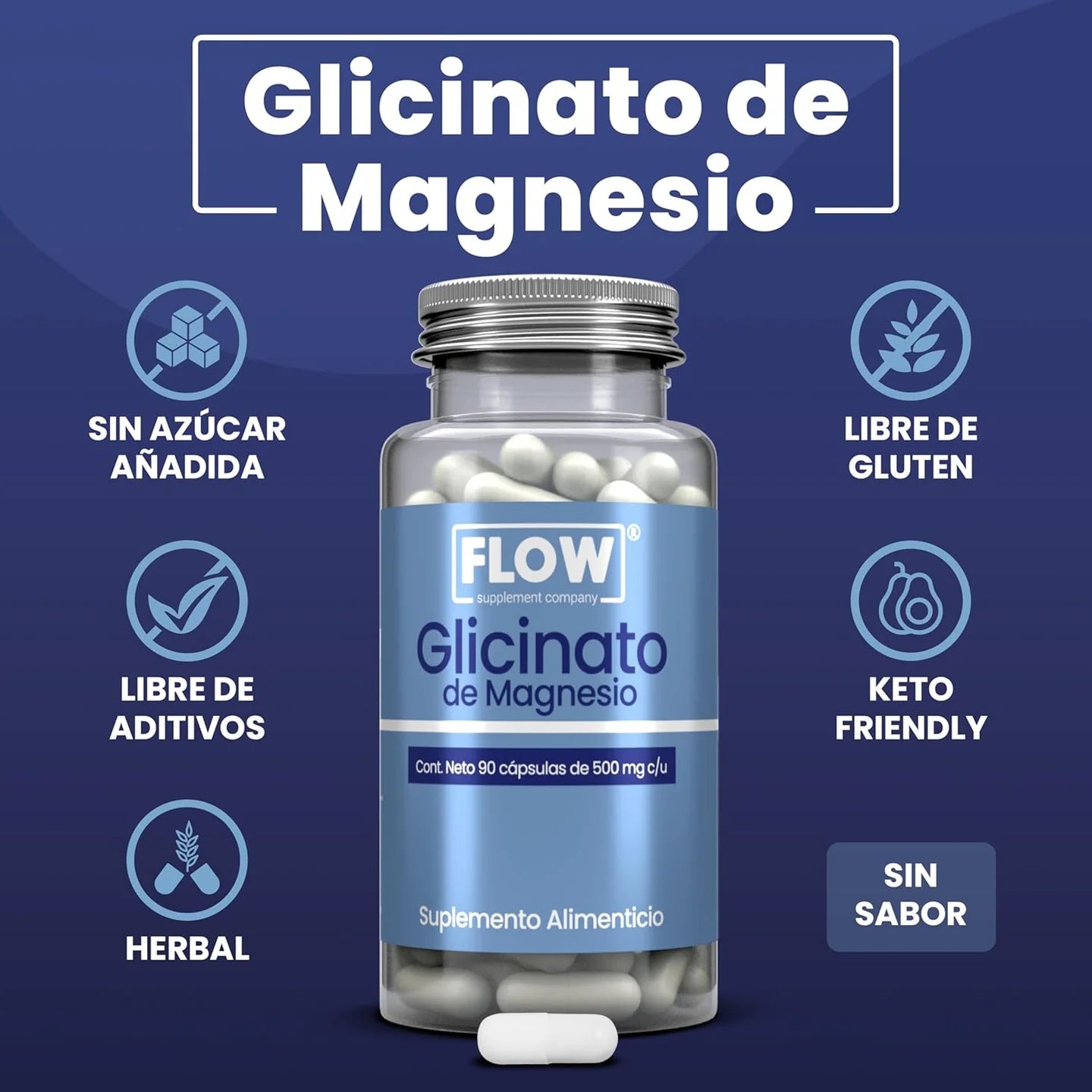 Glicinato de Magnesio 500mg de Flow Supplements | Apoya la función muscular, ayudando a prevenir calambres y espasmos, como así también la función nerviosa | 90 cápsulas vegetales