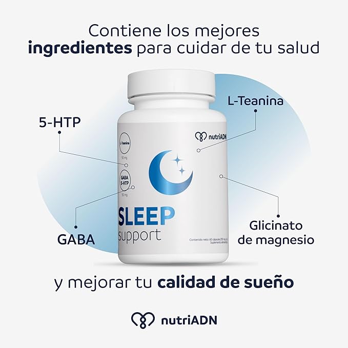 Sleep Support de NutriADN es un suplemento formulado con ingredientes clave como GABA, 5-HTP, L-Teanina y magnesio para apoyar un descanso profundo y reparador. Ideal para quienes desean mejorar su calidad de sueño de manera natural y segura.