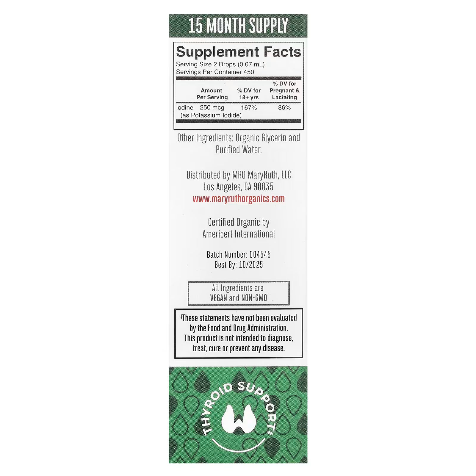 El Yodo Orgánico de MaryRuth's es un suplemento líquido elaborado con ingredientes certificados orgánicos, diseñado para apoyar la función normal de la tiroides y el metabolismo. Aporta 250 mcg de yodo por gota en una fórmula sin sabor y de fácil absorción.