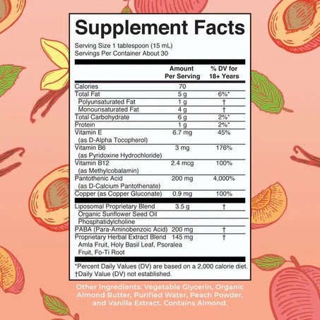 Gray Guard es un suplemento liposomal sabor durazno-vainilla que combina PABA, cobre, vitaminas del complejo B y una mezcla herbal (amla, fo-ti, albahaca santa, psoralea). Aporta vitamina B12, vitamina E y ácido pantoténico en una base con fosfatidilcolina para favorecer la absorción y apoyar el color natural del cabello.