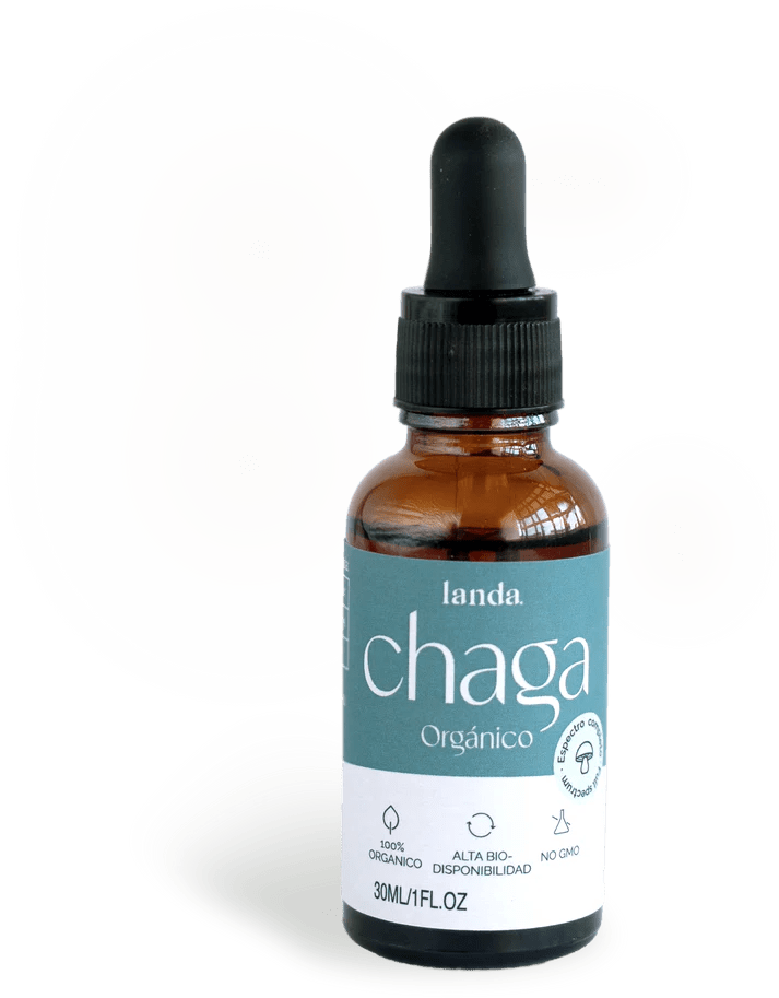 El extracto de Chaga orgánico de Landa es una fuente natural de antioxidantes potentes provenientes del hongo funcional Inonotus obliquus, cultivado y procesado con estándares orgánicos.