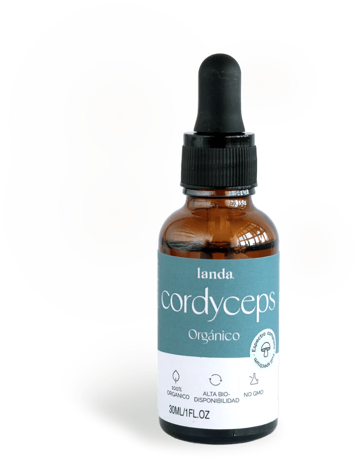 El extracto de Cordyceps orgánico de Landa es un suplemento líquido funcional con alta biodisponibilidad, elaborado con Cordyceps militaris, un hongo adaptógeno que mejora la resistencia física y promueve un metabolismo equilibrado.