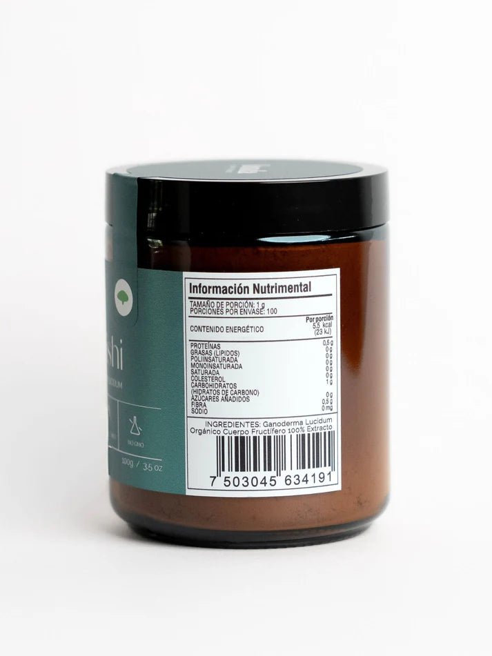 Ingredientes: 100% extracto orgánico del cuerpo fructífero de Ganoderma lucidum (Reishi). Libre de rellenos, gluten, soya y organismos modificados genéticamente (No GMO).