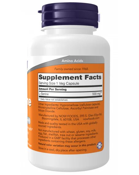 L-Serina 500 mg, Now,| Favorece la función cerebral y la memoria| 120 Cápsulas
