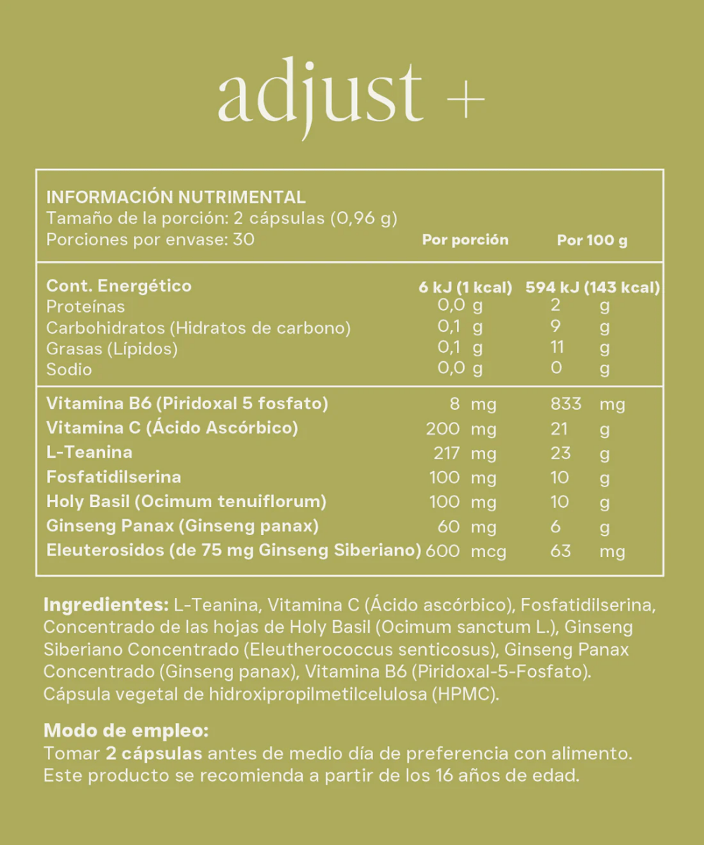Reset Adjust+ es un suplemento natural en cápsulas que combina L-teanina, ginseng panax, ginseng siberiano, holy basil, vitamina C, vitamina B6 y fosfatidilserina. Su fórmula ayuda a mejorar el enfoque mental, reducir el estrés y apoyar el equilibrio emocional, siendo apto para dietas vegetarianas y libre de gluten.
