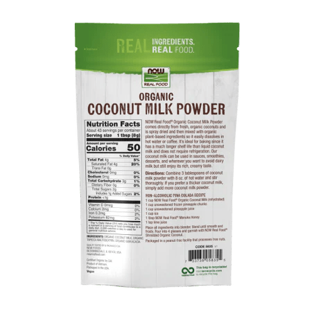El Organic Coconut Milk Powder de NOW Real Food es una leche de coco en polvo orgánica y cremosa, elaborada a partir de cocos frescos. Es vegano, libre de lácteos y Non-GMO, ideal para bebidas, repostería y recetas saladas.
