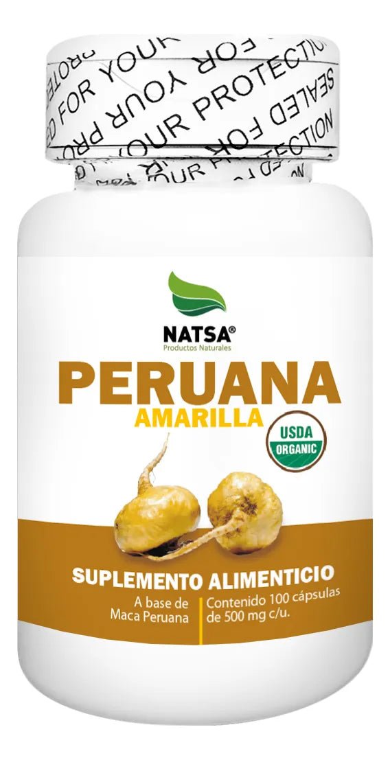 La maca amarilla (*Lepidium meyenii*) es una raíz peruana utilizada ancestralmente como fuente de energía, resistencia y fertilidad. NATSA ofrece esta presentación con certificación USDA Organic, en cápsulas de 500 mg que garantizan una dosificación práctica y efectiva sin necesidad de preparación previa.