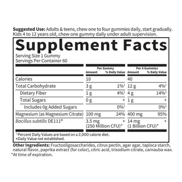 Magnesium Gummies de Garden of Life es un suplemento masticable con 100 mg de magnesio citrato, combinado con prebióticos y el probiótico Bacillus subtilis DE111®. Su fórmula ayuda a mantener el bienestar digestivo, promover el sueño profundo, reducir el estrés y apoyar la recuperación muscular. No contiene azúcares añadidos, soya, lácteos ni gluten.