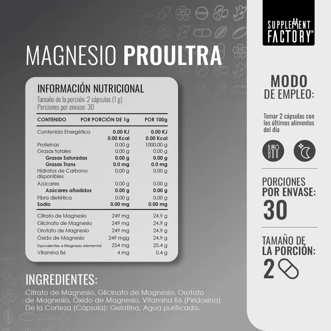 Magnesio PRO Ultra de Supplement Factory es un suplemento mineral de alta biodisponibilidad que combina cuatro formas de magnesio para mejorar su absorción: citrato, glicinato, orotato y óxido. Su fórmula está reforzada con vitamina B6, la cual facilita el metabolismo y transporte del magnesio en el cuerpo.