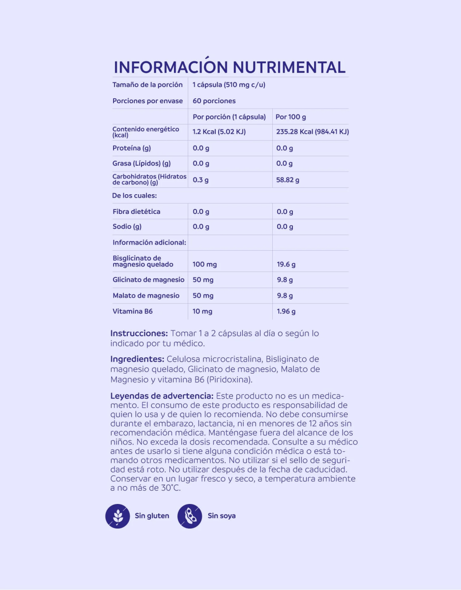 Gracias a sus formas queladas, el magnesio ofrece una absorción superior y un mejor aprovechamiento por el organismo. Es libre de gluten y soya.