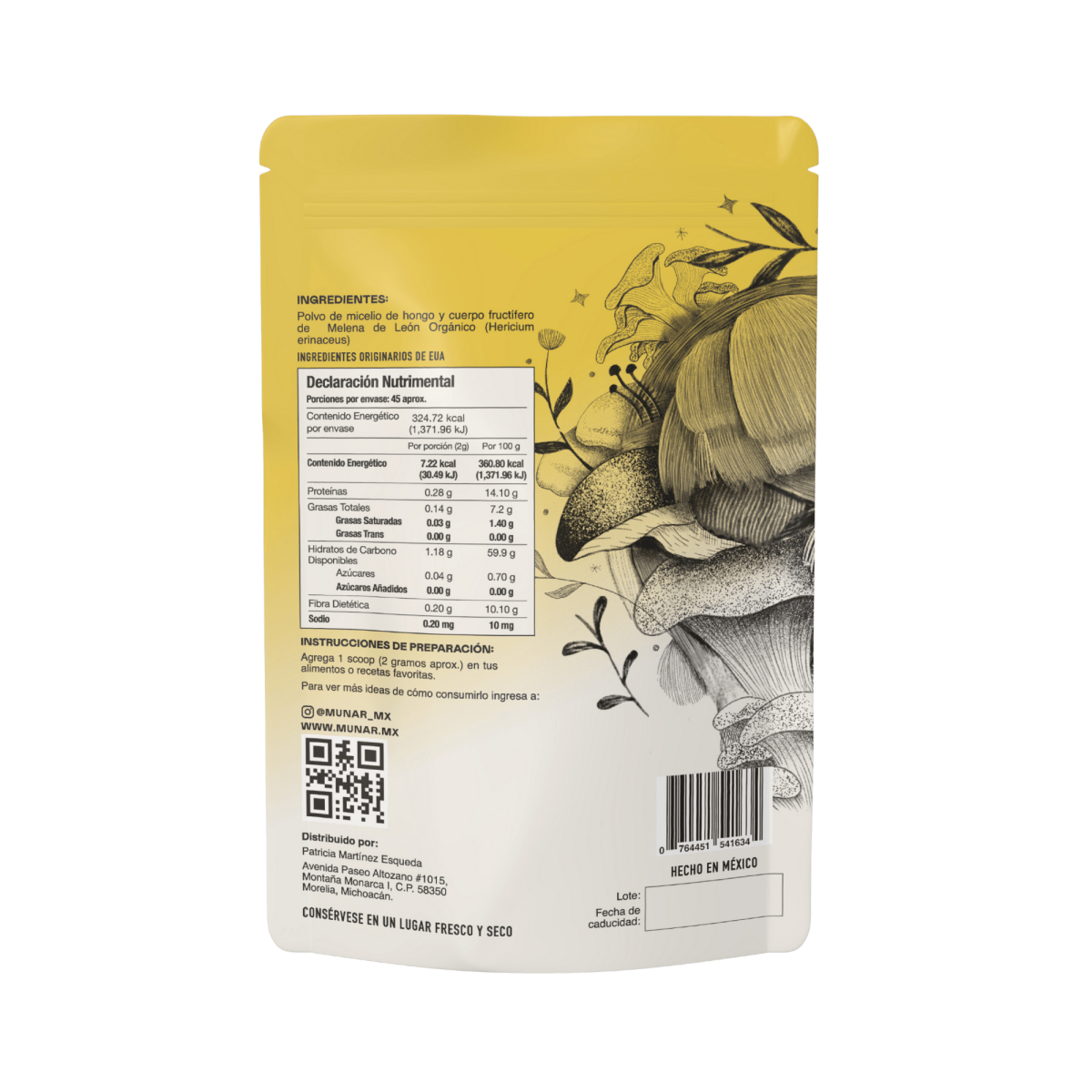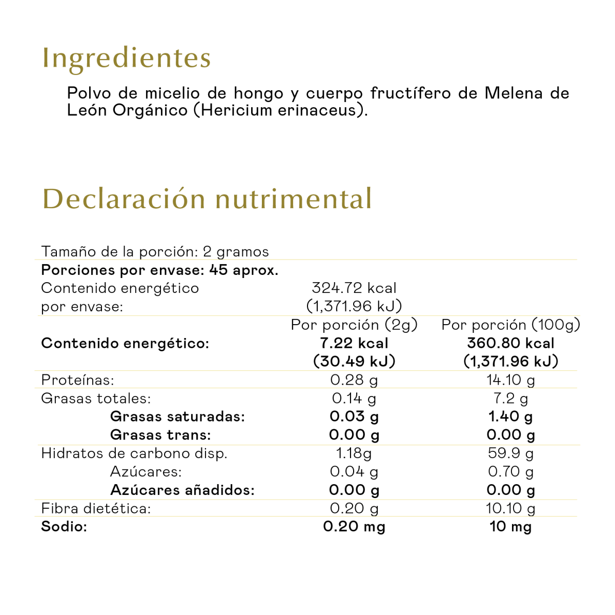 Melena de León Hongo Orgánico de Munar | Sistema Nervioso y Función Cognitiva | Polvos 90 gr