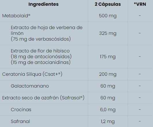 | Metabolaid® (Verbena de limón + Hibisco estandarizados) | 500 mg | N/E |