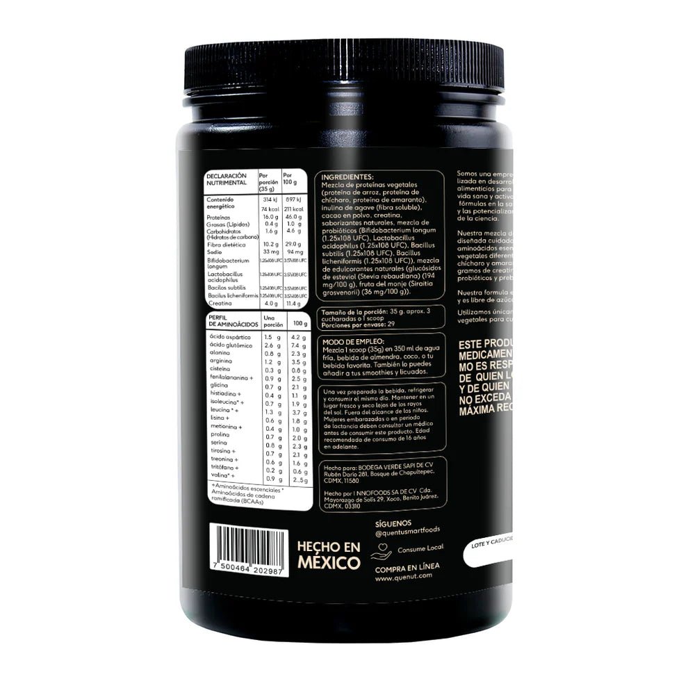Proteína Vegana Chocolate de Quenut es un suplemento en polvo a base de proteína vegetal (chícharo, arroz y amaranto), enriquecido con creatina y probióticos para favorecer la recuperación muscular y la salud digestiva. Ideal para personas que siguen una alimentación basada en plantas, libre de lácteos y soya.