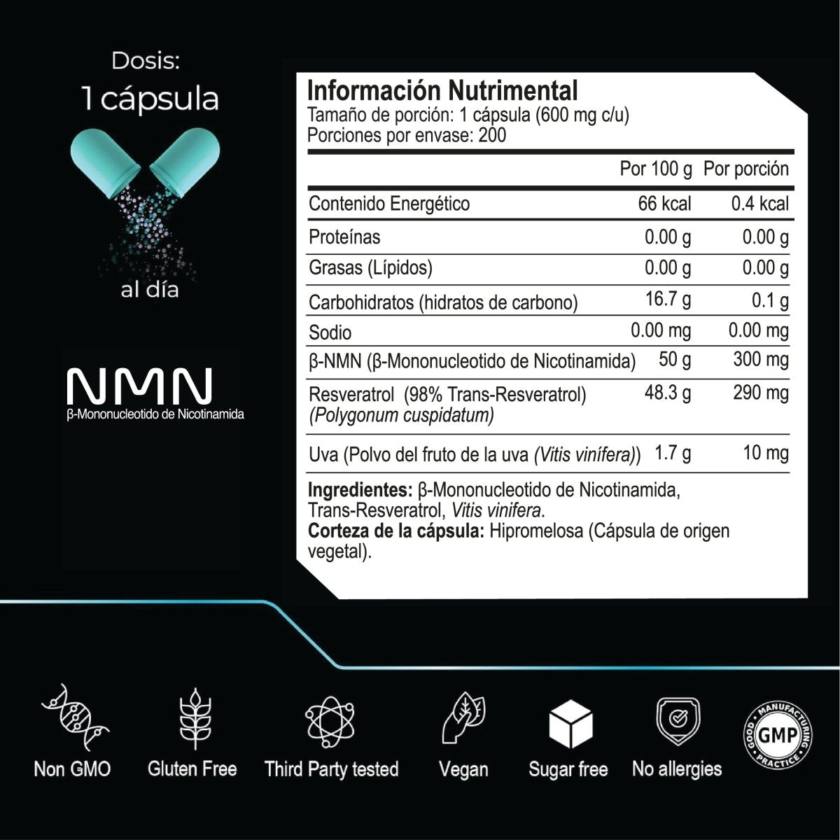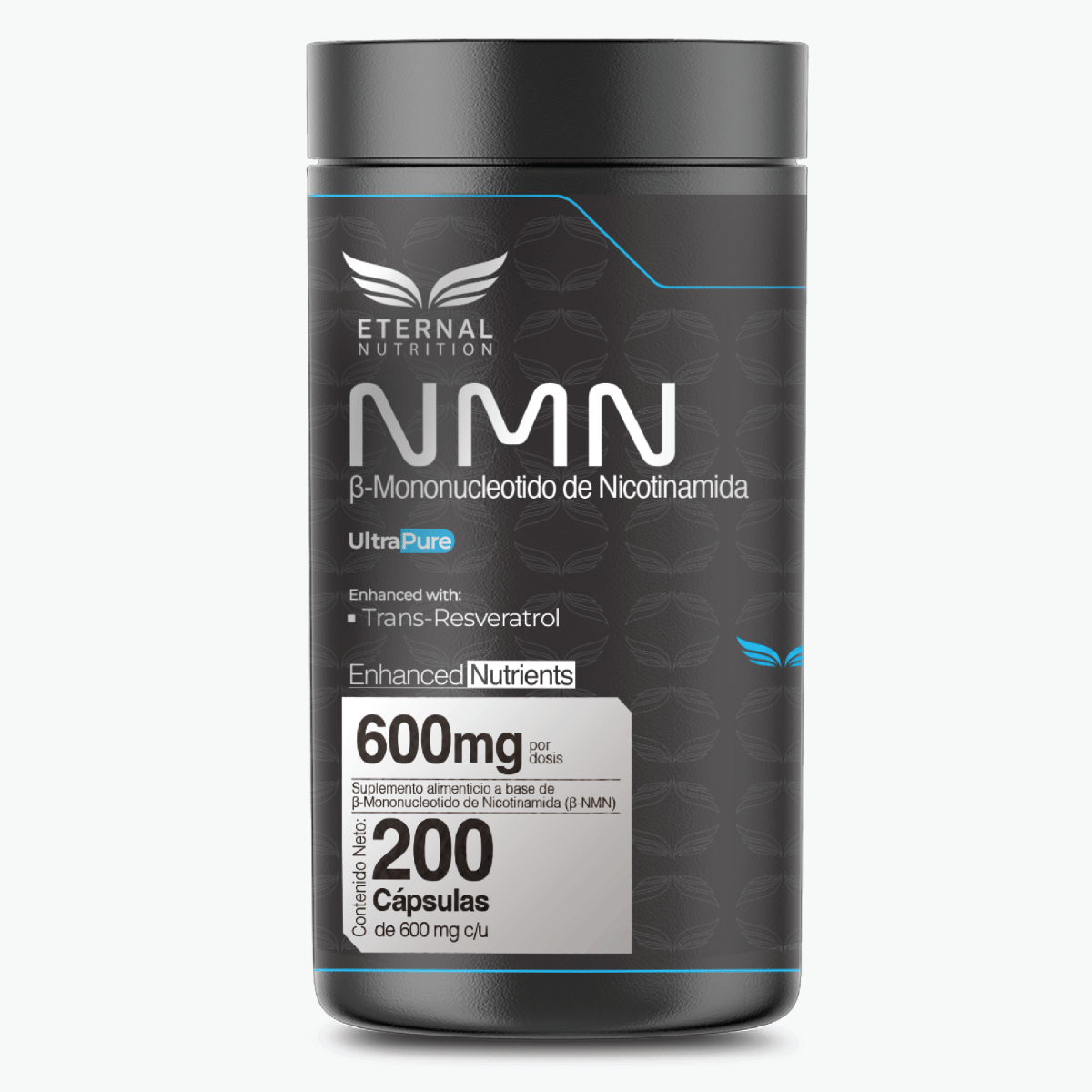NMN Eternal es un suplemento de alta tecnología con β-Mononucleótido de Nicotinamida, un precursor esencial para la producción de NAD+, clave para la energía celular y la longevidad. Su fórmula incluye trans-resveratrol 98% y extracto de uva (Vitis vinifera), que actúan sinérgicamente como potentes antioxidantes naturales.